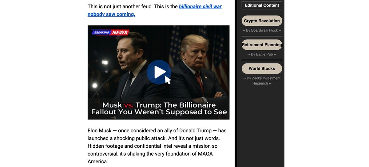 This is all kayfabe — in this case, a link in the email sends you to an endless pitch video having nothing to do with Musk (“Trump’s ‘Secret Project’ Stuns Investors — 3 stocks to buy before Congress approves the Pentagon’s historic $1 trillion budget”). Its real point is that Musk is an opponent worthy of Trump, as King Kong is worthy of Godzilla, and that their battles will be entertaining and perhaps financially educational — why not click through to see?