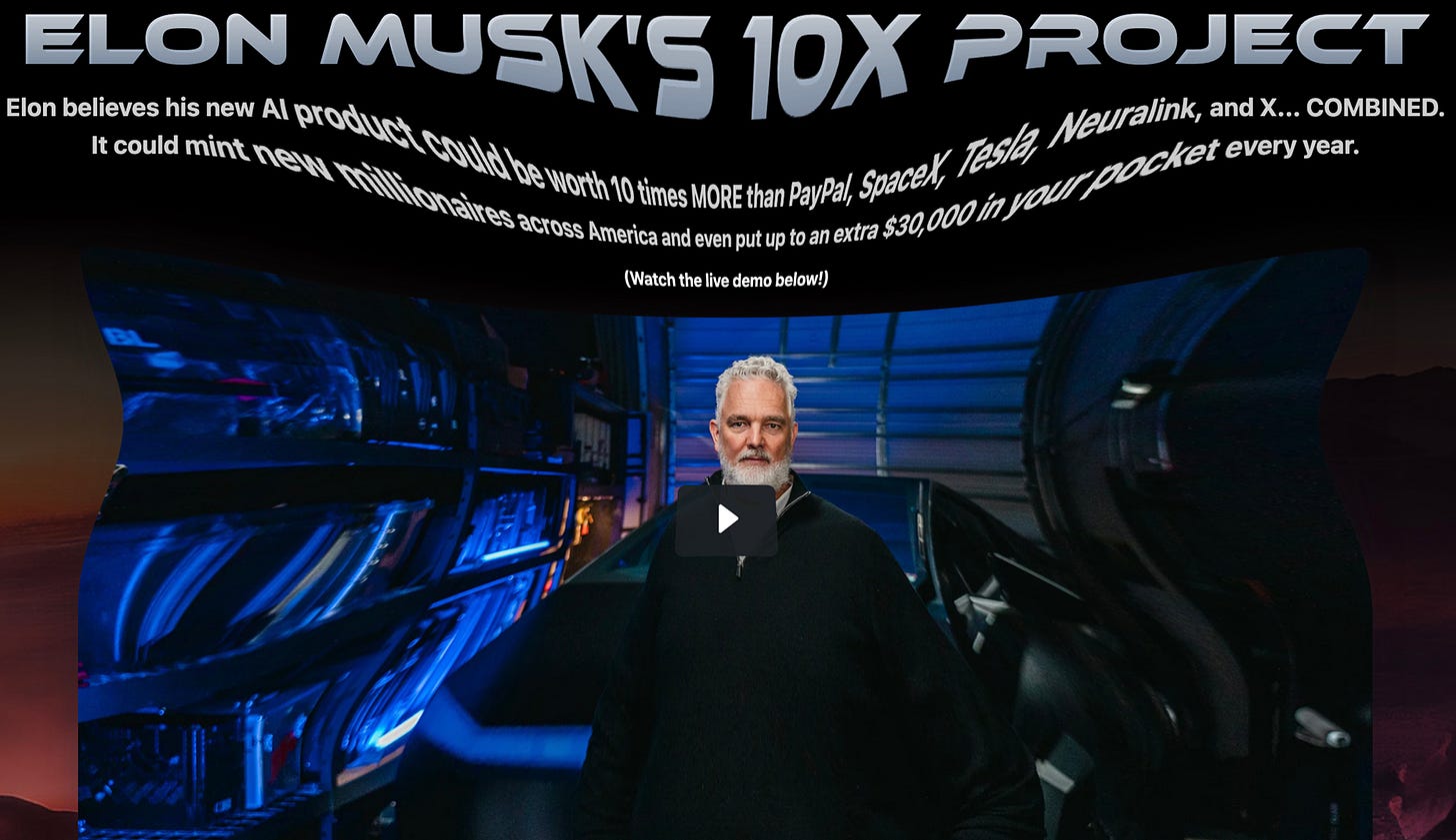 This pitch, too, leads to a video: “Tech legend who predicted the rise of Bitcoin, Nvidia, and Tesla reveals…” Hey, it’s Techbro Christmas again! But in this case the topline is “Elon Musk’s 10X Project… Elon believes his new AI product could be worth 10 times MORE than PayPal, SpaceX, Tesla, Neuralink, and X... COMBINED. It could mint new millionaires across America and even put up to an extra $30,000 in your pocket every year. (Watch the live demo below!)”