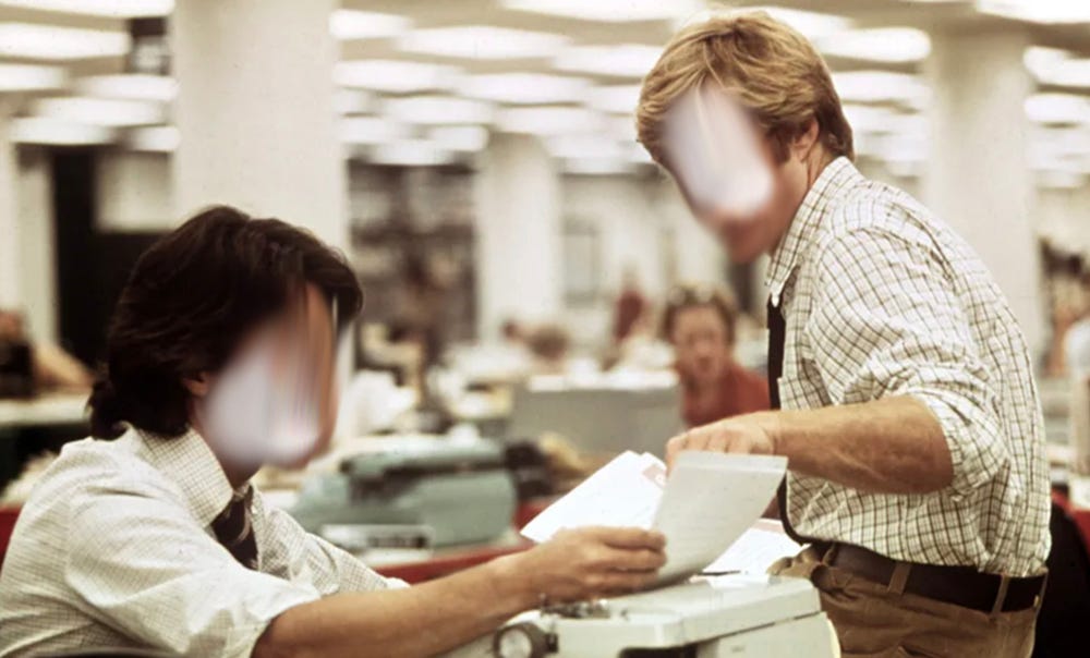 [What looks like a private dining room at Delmonico’s at the turn of the 20th Century, but is in fact part of a suite of BARI WEISS’ offices at CBS News. Seated around the tablecloth with tumblers, coffee cups, and Macbooks Pro are WEISS, dressed in a light blue Elisabetta Franchi belted wool suit and black Gucci Alfa ballet flats with gold buckles; chief flunky OLIVIA REINGOLD, wearing a Carolina Herrera Nautilus floral sleeveless knee-length dress and light blue suede Santoni high-heel slingbacks that she has kicked off and set aside; and a 20ish man, DANNY, and a 20ish woman, CLARE, in modest business dress with no distinguishing characteristics.]