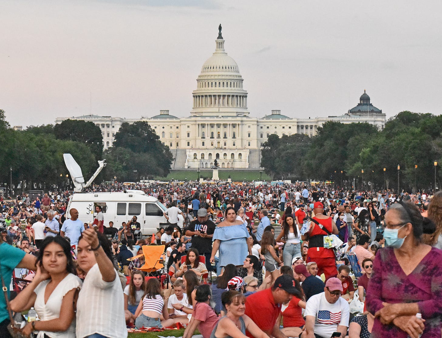 But I’m American enough that I like loud noises. Fireworks are legal in the District and plywood stands selling them, crammed into corners of parking lots, do brisk business in the last weeks of June. Pandemic July was a quieter than previous years but this one was lit. I dropped by the Mall to see the first post-COVID fireworks crowd gather. The people mainly seemed happy to have a real public spectacle to attend. They sprawled on blankets, read, played cards, ate picnic lunches. The spectators nearest the Washington Monument, the front row so to speak, were pretty well jammed up, but the crowding eased as you went back toward the Capitol, and some folks just said fuck it and hung around the Congressional reflecting pool and even further back on Capitol Hill, content with the beautiful summer weather and to share it with friends and be part of an old-fashioned festivity.