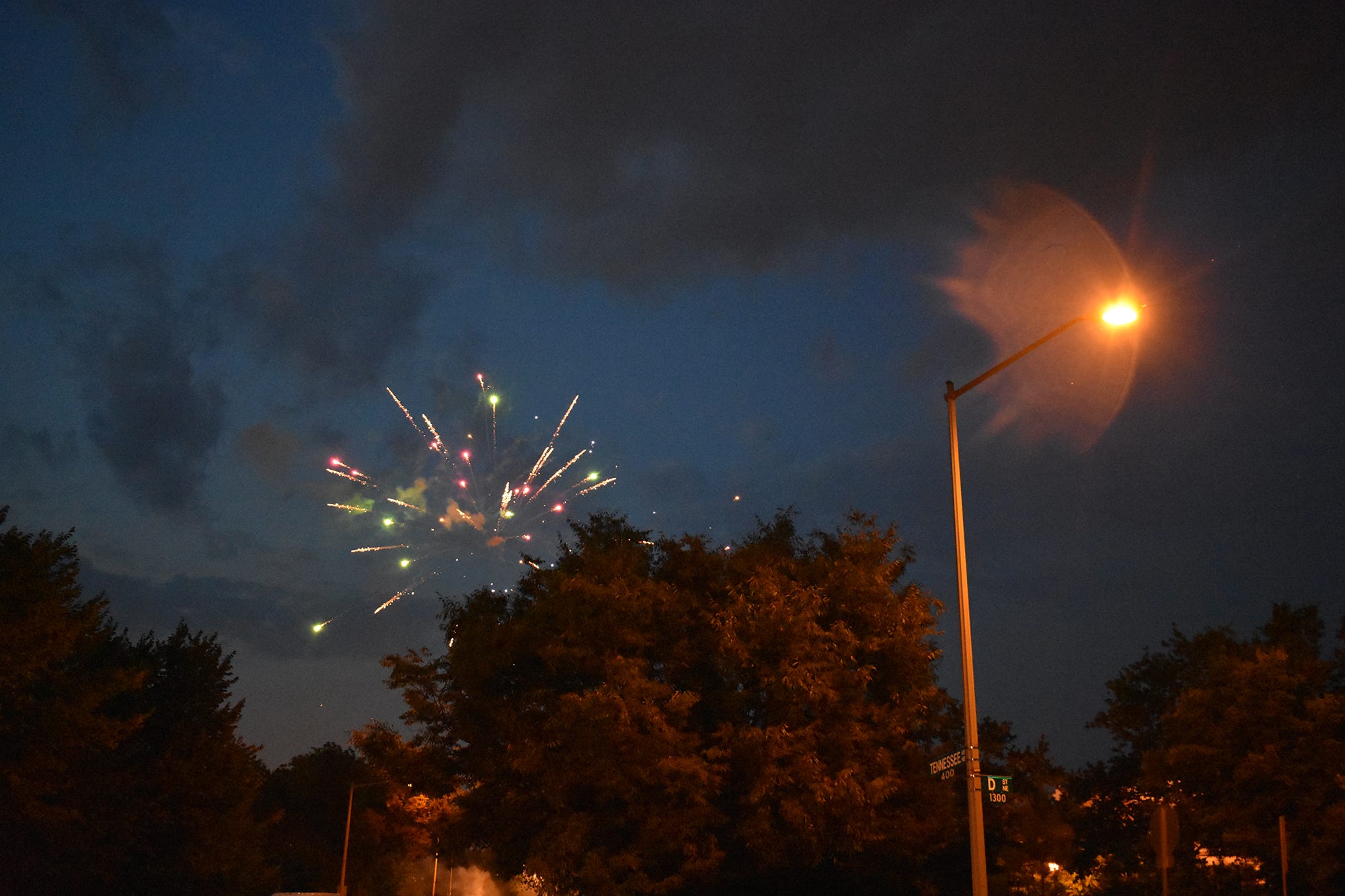 I left before the show and in time for the local amateur fireworks, which were awesome — not as elegant or consistent as that of the pros, but spirited and persistent. As soon as I passed Union Station the bombardment was constant — firecracker rain-showers, M-80 thunderclaps, skyrocket blossoms, and clouds of smoke. One of several set-ups was on the traffic island bordered by 14th Street NE, Tennessee Avenue and E Street; a flight of missiles and rockets would blast off and, as the pile smoldered, shadowy figures would creep in with fresh ordnance as locals watched in silent approval from corners, stoops, and retaining walls. In dozens of such stands they churned out explosions for hours, winnowing around midnight.