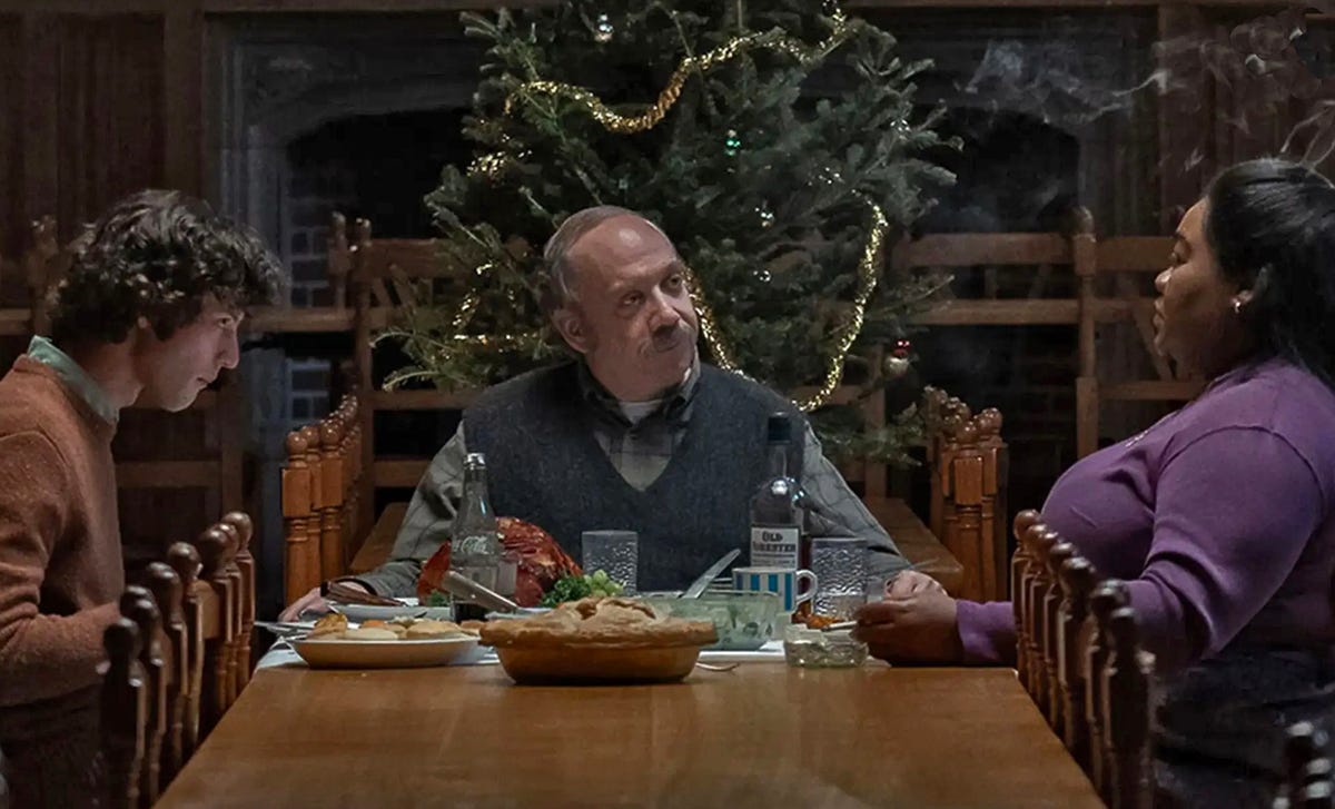 This is somewhat in the territory of Wes Anderson’s Rushmore, and I think Payne is aware of and leverages that; he even lards in old pop music cues as Anderson did (one of which, Cat Stevens’ “The Wind,” was also in Rushmore). But where this gave the earlier film the feeling of a fable, it gives The Holdovers a nostalgic tinge, and a suggestion of introversion, as if the events were being remembered rather than enacted.