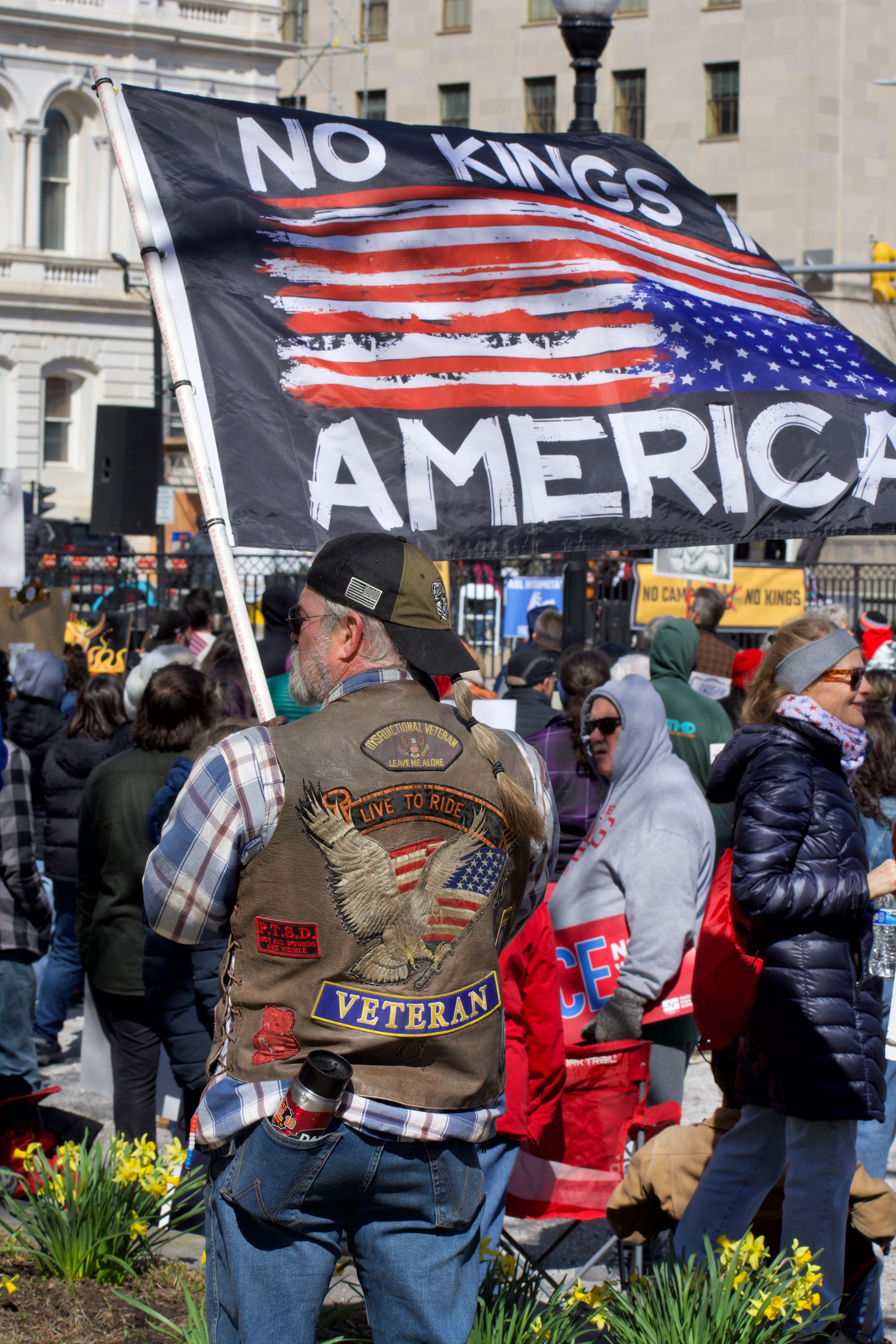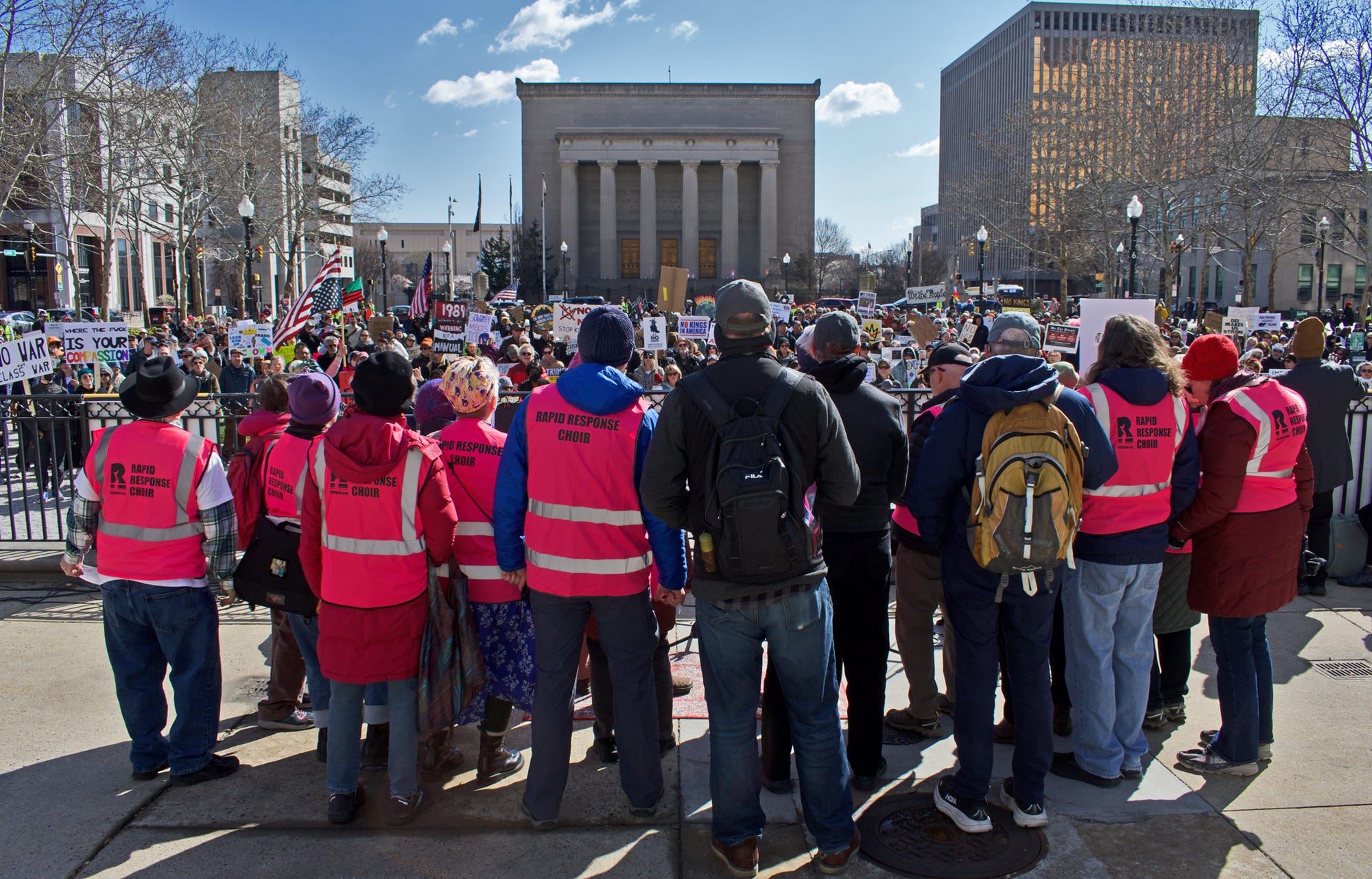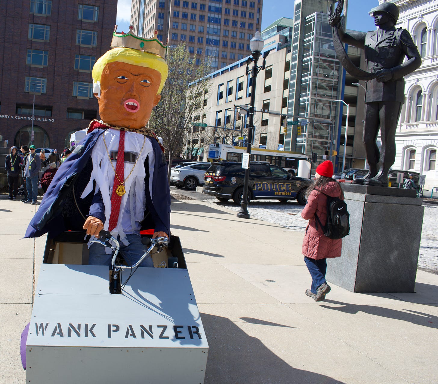 Me, I went in the morning down to the square between Baltimore City Hall and the War Memorial, which was packed. I heard some speeches and some chants. (Did I imagine that some speakers who led chants said “No Pimps” instead of “No Kings”?) I heard the Rapid Response Choir lead attendees in protest singalongs (“Lift up your eye Lift up your eye! Don’t you despair Don’t you despair!”). I saw a crowd that did indeed, as the Times’ survey source suggested, contain a lot of oldsters, women, and educated granola people who would not be out of place at a Sweet Honey In The Rock show — but also a lot of young people, who had the saltiest signs (like the boonie-hatted guy carrying one that read “SAVE A LIFE/ KILL A NAZI/ FRAG YOUR C.O.”) and many just plain normies, often with kids and dogs. It was a nice day, sure, but a little cold — these people could have done something indoors, or gone to the Zoo or the Harbor or the Orioles game. The thing had something more than passing interest for them.