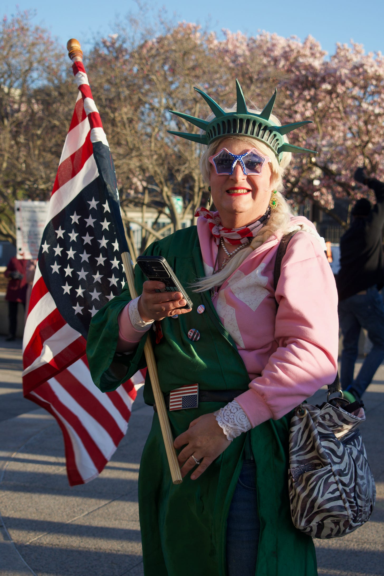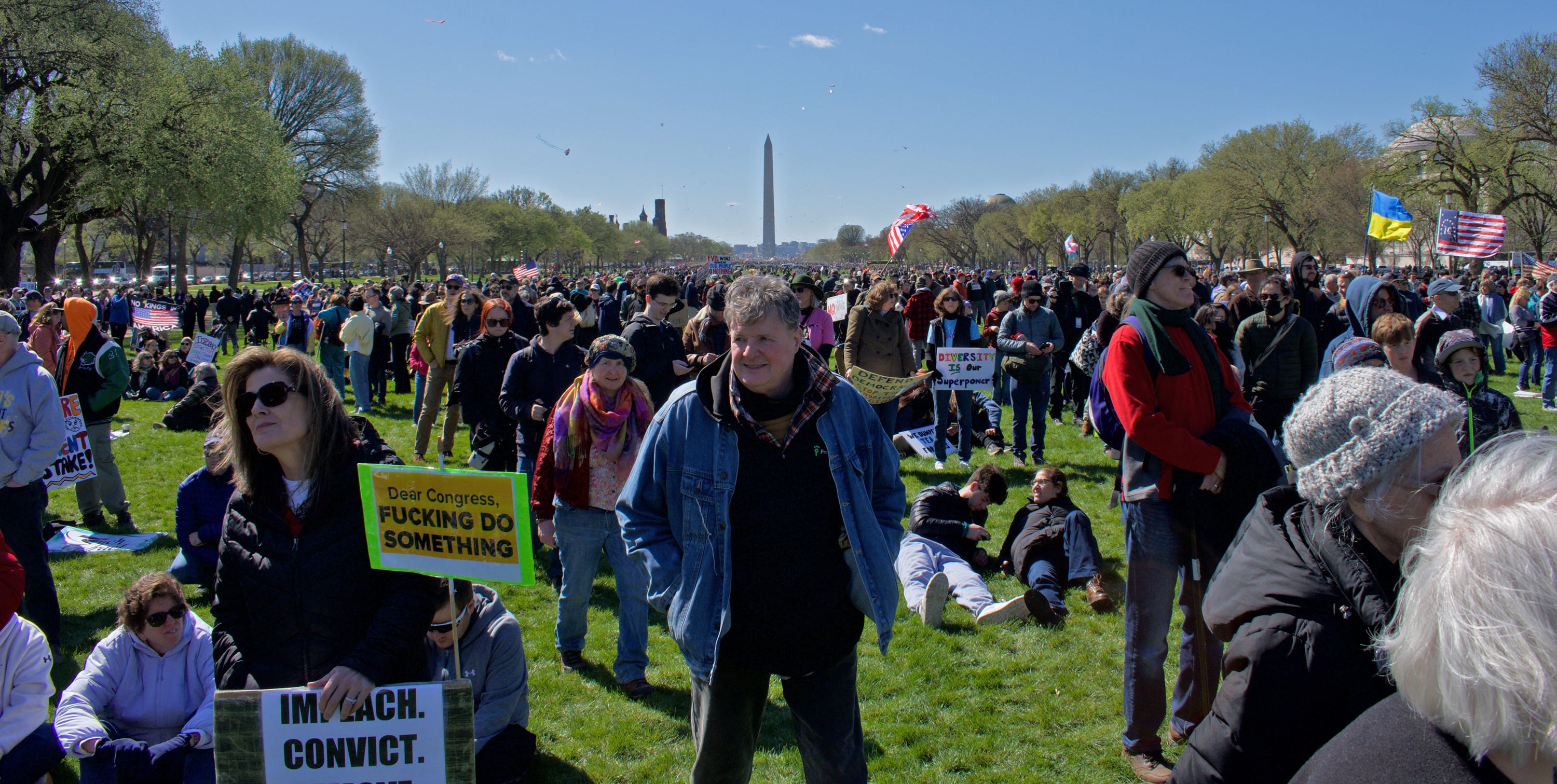 That was also the case at the D.C. rally, to which I arrived late; lots of people with signs were leaving as I got there and the stage had been given over to the failed-open-mic types (like one young lady who, in the midst of a meander about Love, announced a song and then announced that she had forgotten the words). But it was still a cool scene. Further down the Mall, people were strolling and lounging, sometimes with signs, and sometimes flying kites (the Blossom Kite Festival was the same day); protest, it seemed, was melting back into real life and, past experience suggests, would return the same way. Expect us!