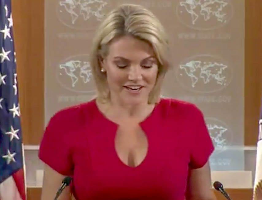 [TRUMP goes back behind the desk, turns the footage of Heather Nauert back on, and picks up the red phone.]