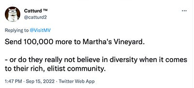 The latest stunt is Abbott’s co-bag Florida Governor DeSantis picking up immigrants from Texas and flying them to Martha’s Vineyard. (I assume they had a big basket labeled LIBTARD CITY’S and dropped slips of paper into it marked “Aspen,” “Burkly,” “Place where Harverd is,” etc. and then pulled the MARTHAS VINYERD one out.) They also sent some immigrants to the Vice President’s residence in D.C. as a sort of asshole lagniappe.