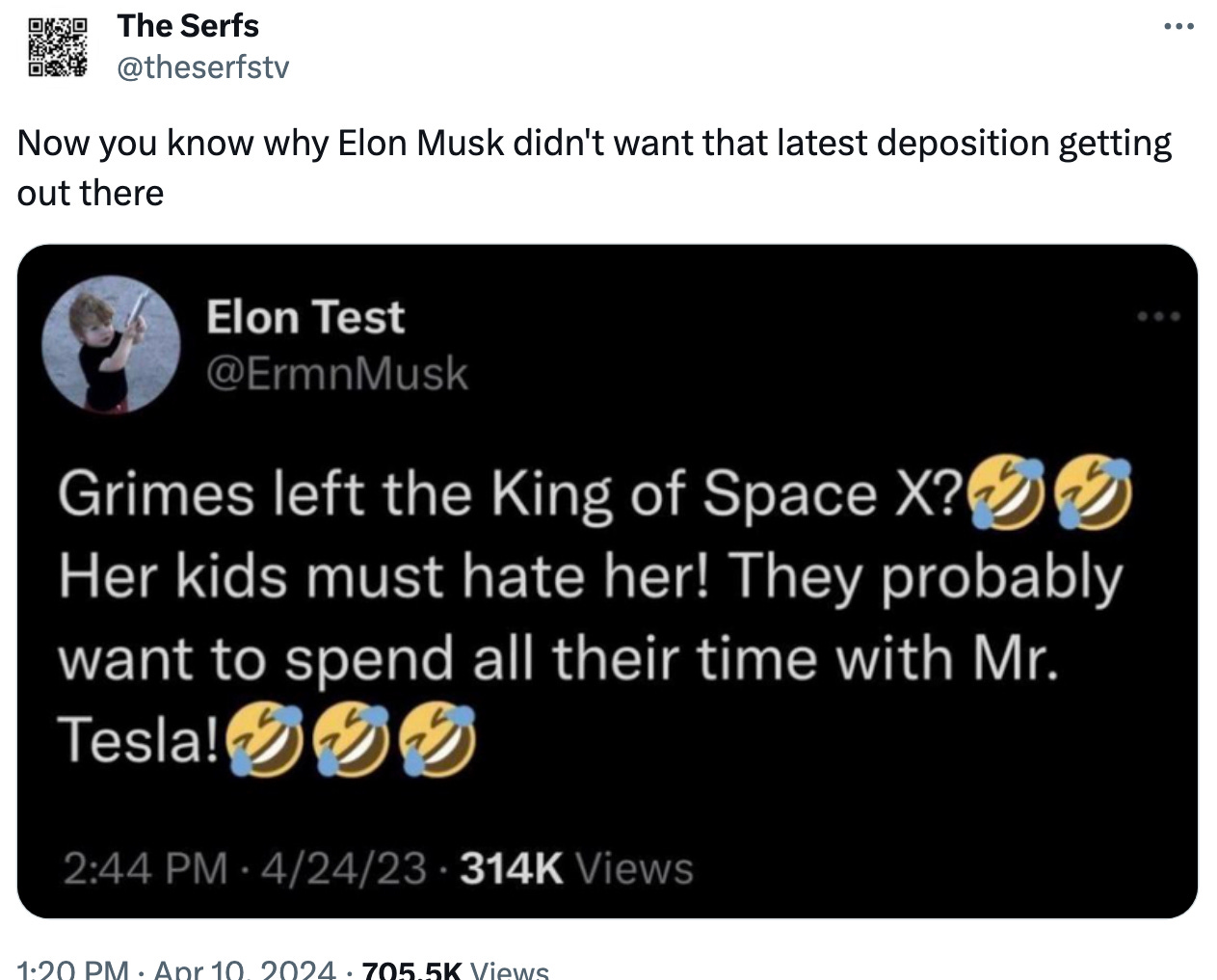 This stuff – the transcripts, et. al., not Roy’s excellent parody – are why I don’t worry about Musk successfully running for political office. He has “loser” written all over him so explicitly, in a way few men have. It's so explicit he can’t even cover it up with billions of dollars. His self-parodying Dr. Evil vibe is too powerful.