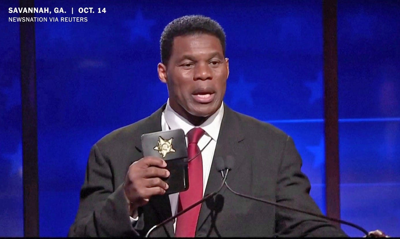 Herschel Walker was widely mocked and criticized for flashing an honorary deputy sheriff’s badge onstage at a Georgia Senate debate Friday after his Democratic opponent, Sen. Raphael Warnock, called him out for pretending to be a police officer.
