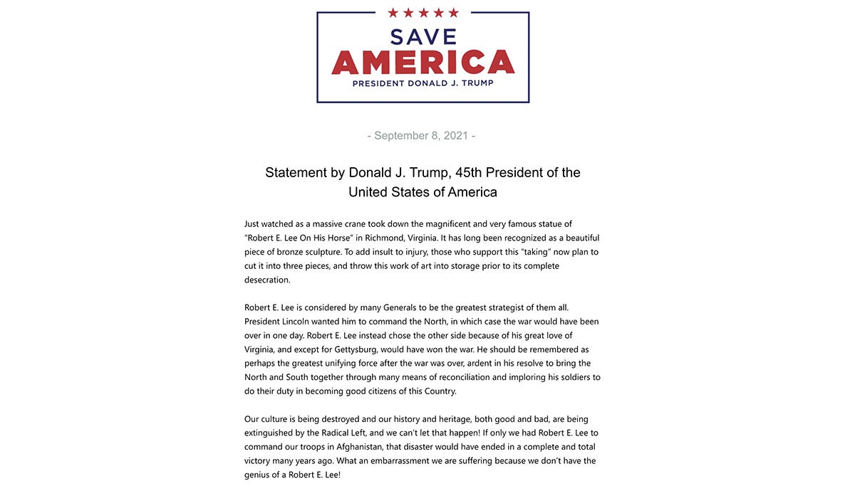 TRUMP: Yes General Lee I have ordered your statue put back together and we will bring it to Washington and put it up where the colored have to look at it all the time.