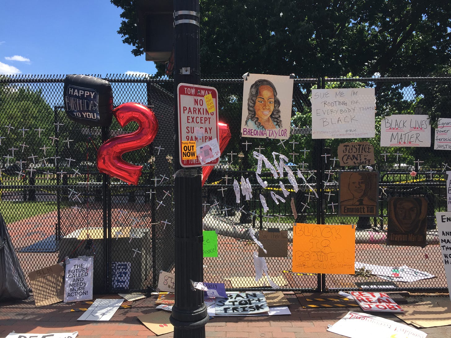 On Sunday I came back to the protest scene or, as we Washingtonians like to call it (and its new official name), Black Lives Matter Plaza. Everything was chill. Some men were solemnly playing a speech about the Prison-Industrial Complex on a boombox, and a half-dozen visitors stood and listened; freelance leaders bade us chant, kneel, tell our friends, do more. St. John’s, even with its windows boarded up, looked handsome in the sun, and a protest medic set up shop against its wall. The free snacks and water flowed. Tubby was holed up behind his fences, which protestors had festooned with Black Lives Matter art and messages. Tubby has snipers on his roof and money in his vault and grifters in his pocket and racists on his side. But dem soft, yes dem soft.