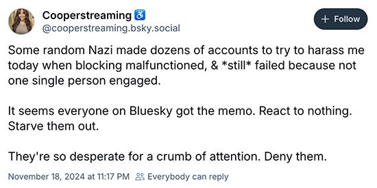 You know me — I’m a big arguer and teller-offer, and I did a lot of that on Twitter. But it struck me upon my reentry to Bluesky that there’s something to be said for not fighting all the time or even any of it. I don’t think I’ve changed much, and I’m still bitching out creeps and feebs, but I no longer instinctually engage them directly or even via quotetweet. I say my say and sit down, like at a Quaker meeting.