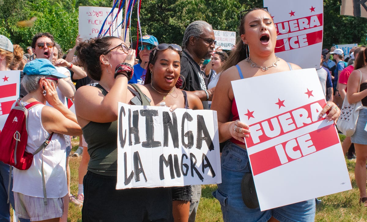 The protocol was as per usual — gather, play music, speeches, then line up and march — but more multifocal than most, as it was spread out over the large central elevation of Malcolm X Park; each little group made a cluster, from the unions like UNITE HERE in their bright red shirts to the immigrant-rights crew on their little platform with a generator-driven PA exhorting the crowd in English and Spanish to the bullhorn-bearers marching back and forth leading call and response chants. But it wasn’t a chaos or Babel; the energy that had brought everyone there was the same and held it together.