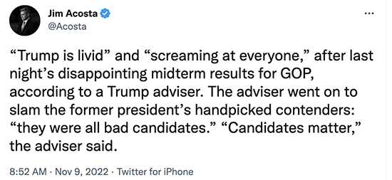 In addition to blaming the voters, Zito also dropped some shade on Donald Trump for “interfering” with the Pennsylvania election — by which I guess she means he endorsed Oz, which I hadn’t heard her complaining about before Oz lost.