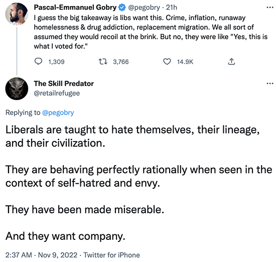 I take pleasure as well in the suffering of the rightwing gomers who were sure they were getting a red wave. I particularly liked the sputtering response of this famous fash fucknut and camp followers like the “Skill Predator” here:
