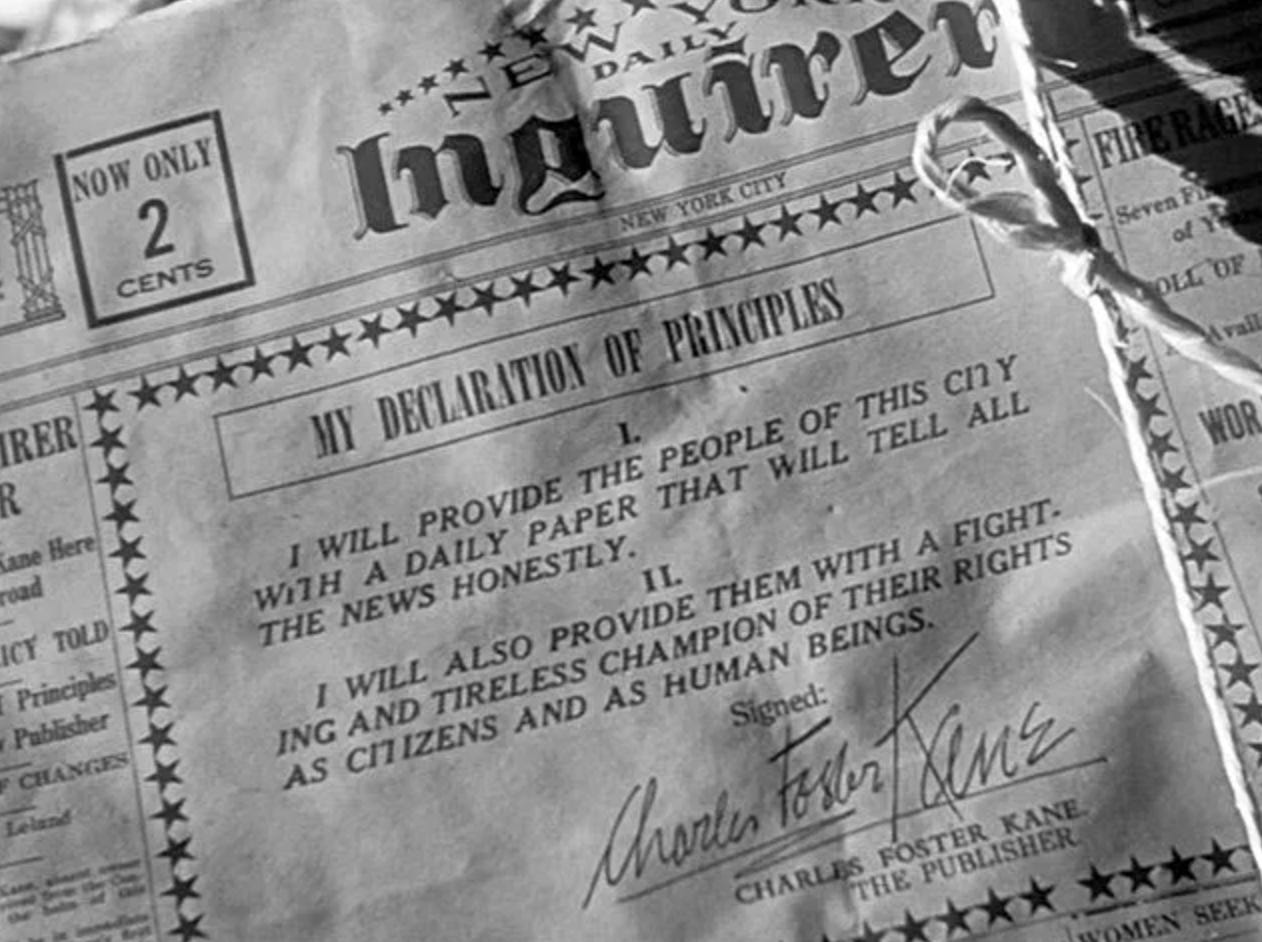 The blather from Musk’s announcement about how “free speech is the bedrock of a functioning democracy and Twitter is the digital town square where matters vital to the future of humanity are debated” is his version of Kane’s Declaration of Principles — the sententious front-page pledge of honesty and respect and support of the readers’ rights with which Kane hoped to make his media empire “as important to New York as the gas in that light.” Except you can’t imagine Citizen Musk ever being mortified when, later on, someone who once believed him throws those shredded principles in his face — because Musk never believed in them in the first place. And neither, really, does anyone else.