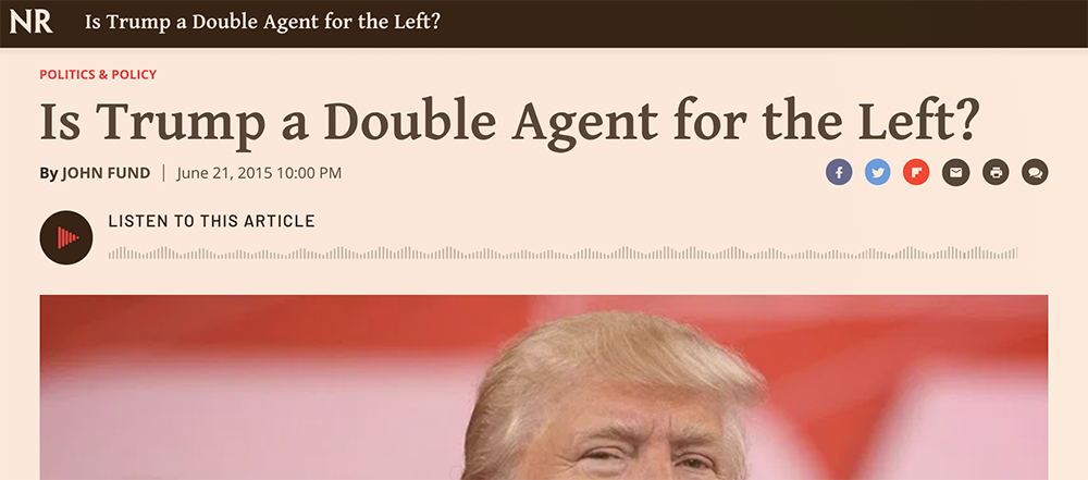 Back in 2015, when Trump first threatened for the nomination, National Review’s John Fund filed a story called “Is Trump a Double Agent for the Left?” Fund, like nearly all NR writers, went on to become an awful Trump sycophant. But maybe, however inadvertently, five years ago he was onto something. Because after this shit, if Americans have anything on the ball, they’ll be hunting conservatives down like dogs.