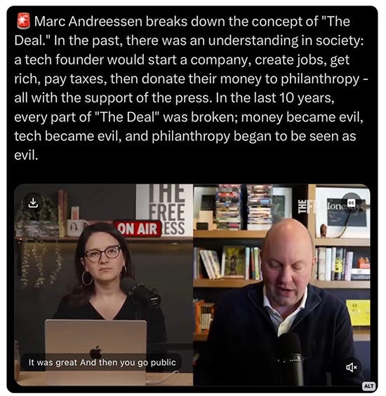 Yet another such rich loon now appears on the internet with billionaire’s friend Bari Weiss to dispense this wisdom: