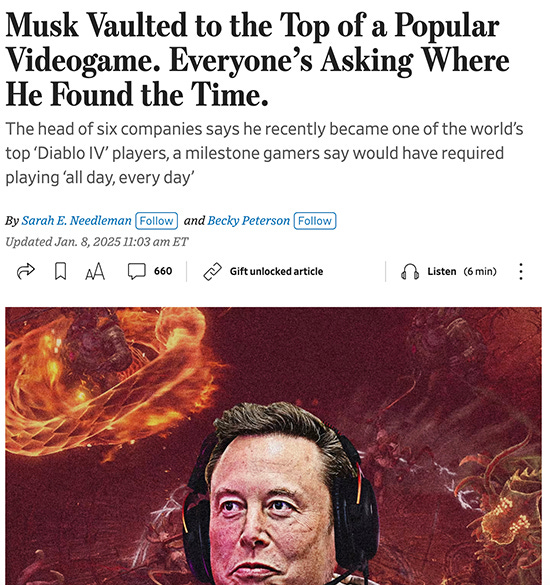 Right off the bat I smelled a rat here, and by the time I reached the deeply-buried (20th graf!) about how “some players speculate that Musk paid someone to ‘grind’ his or her way to the top on his behalf,” I smelled a pack of them. And now gamers are revealing that Musk’s alleged Diablo IV prowess appears to be bullshit.