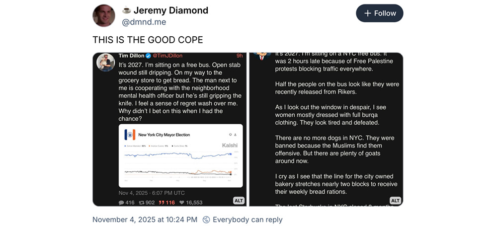 At the Times Ross Douthat tells us “Mamdani’s Victory Is Less Significant Than You Think,” and apparently had that one ready in the can because there was plenty of time for a visual editor to trick it up handsomely and thus distract from its innate stupidity. A highlight: