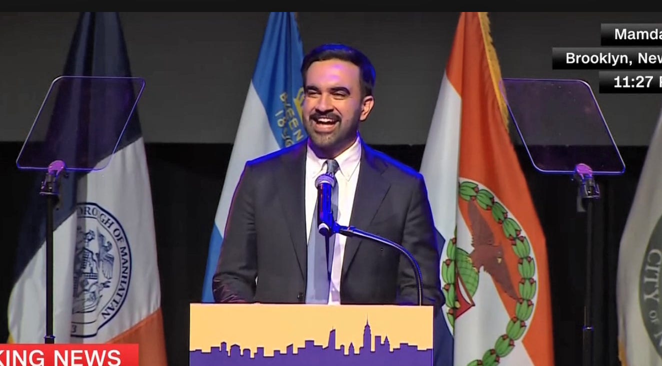 Well, it’s been a better week than most for a sweet old gal I like to call The United States of America. I refer to the great Democratic victories enjoyed Tuesday night, capped by Mamdanimania. It was especially delightful to hear the Mayor-elect’s speech — you can read it here — that began with a quote from Eugene Freaking Debs, froze Andrew Cuomo solid with shade, and most importantly claimed triumph for the working people of New York. Get this: