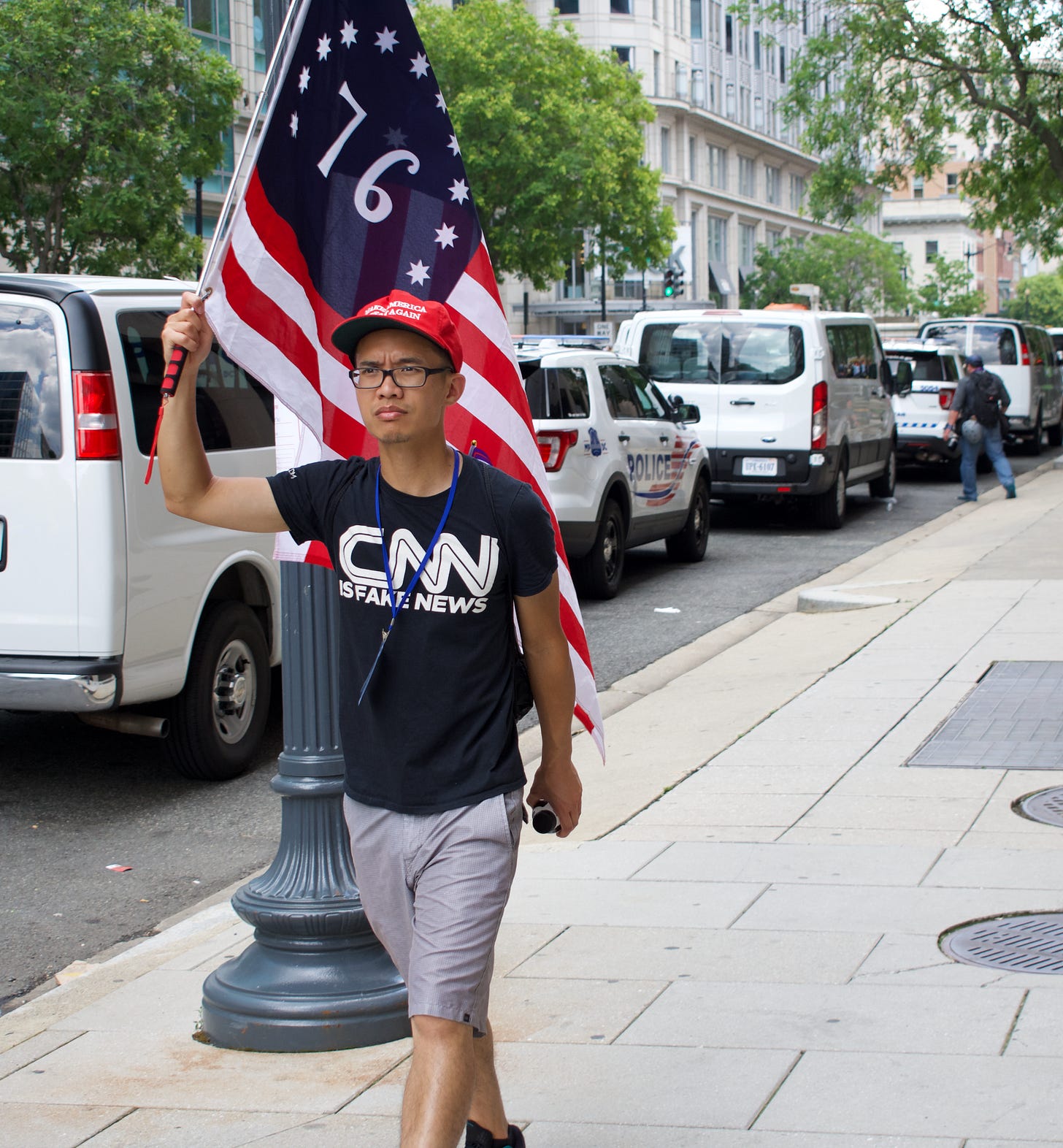 (I did, however, see this young Asian man, sullenly marching around with a Betsy Ross flag and a “CNN is fake news” t-shirt.)