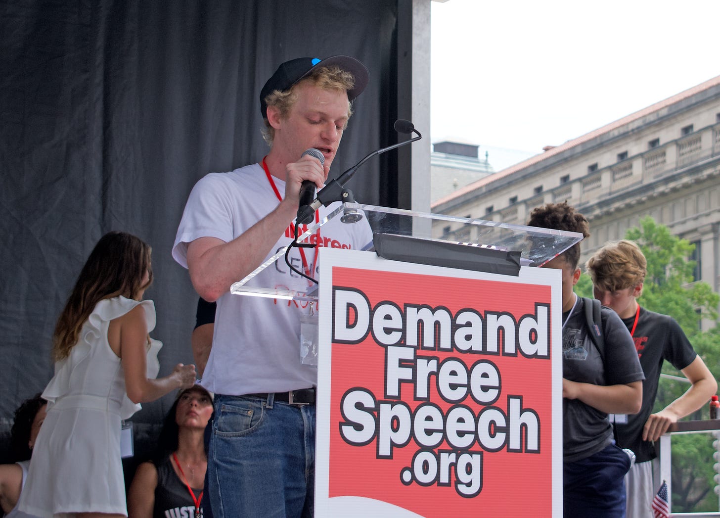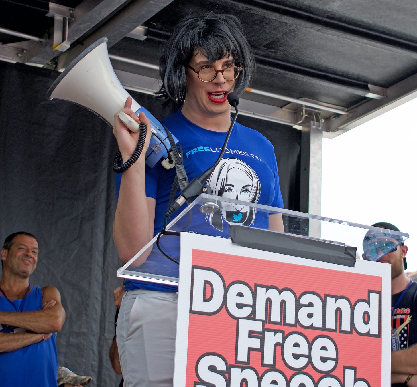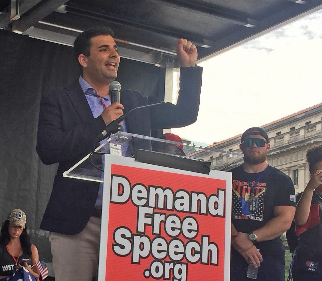 Then came Joey Salas. Salas, from Brooklyn, also travels under the name Joey Salad, in which guise he has become known mainly for pissing in his own mouth and for a badly botched racist video scam, and now claims to be running against Alexandria Ocasio-Cortez for Congress. He claimed to have showed up, not to support his own ludicrous career, but to support freedom of speech. “If you went over there to that terrorist organization side,” Salad claimed, referring to the counter-protest, “and you preached against their organization, they would throw milkshakes filled with cement and punch you in the face.” Salad also claimed to have experienced censorship himself, which is no shock, and affected to be mortally offended over it. “If they want to ban somebody,” he claimed, “they'll go through every piece of content you put up and they’ll try to look for a reason to ban you.” Even if it’s fraud meant to stir racial violence! He then said the crowd needed him in Congress as “somebody who’s not paid off by the big tech companies.”