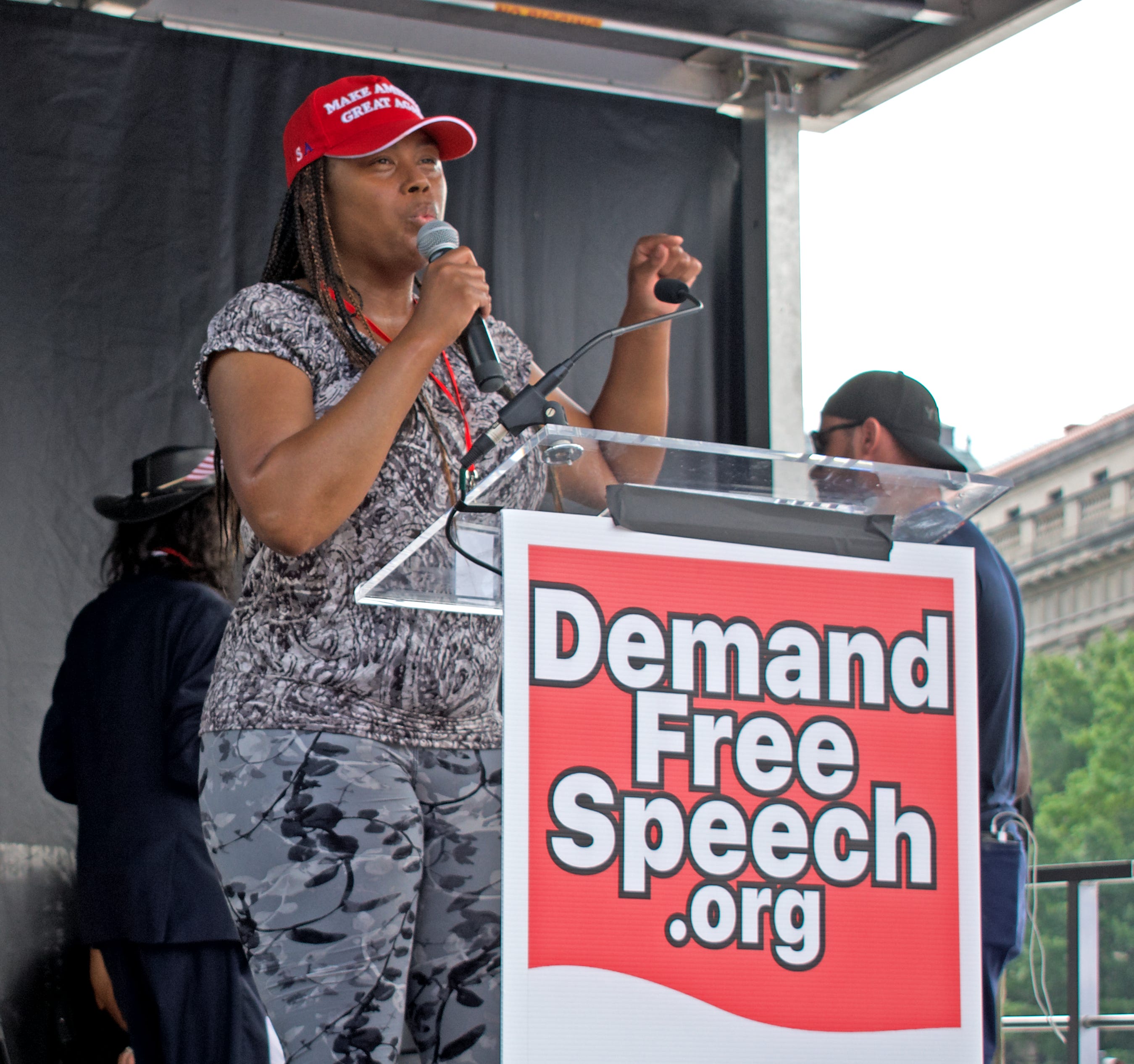 Next was Look We Have a Black Person, introduced as “Kira Ellis” though she was really Kira Innis, granddaughter of the late African-American conservative Roy Innis. She laughed that off — “It’s a funny last name!” — and apologized for her hoarseness, then got hoarser yelling things like “Black Lives Matter is nothing but a racist terrorist domestic hate group,” and “I as a black woman have no freedom of speech! I can’t support my president, I can’t support the wall, I can’t support low taxes...” She also revealed that she’d been banned from the El Capitan theater in Los Angeles for her MAGA hat, and had been temporarily suspended from Facebook because she “dared speak the truth about certain lifestyles.” Innis further regaled the crowd by screaming at unseen enemies that “Donald Trump is your president whether you like it or not” and “if he is not your president then you’re probably not his resident, so get out.”