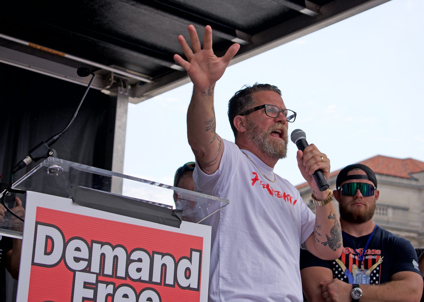 After a few more increasingly ineffective speakers came the Gavin McInnes thing. The Poobah of the Proud Boys was introduced by what I guess is one of his YouTube foils, a comedian called CopperCab, who screamed about free speech awhile, introduced McInnes as “a piece of shit,” then gamely pretended to wrestle with him before leaving. McInnes claimed he had visited on CopperCab “a new kind of head-butt I invented, the body head-butt.” He went on about it, about how “you can fuck up a guy’s ribs... with a head head-butt, you’re really just gonna break his nose at best.” This will give you some idea of what he thought of his crowd.