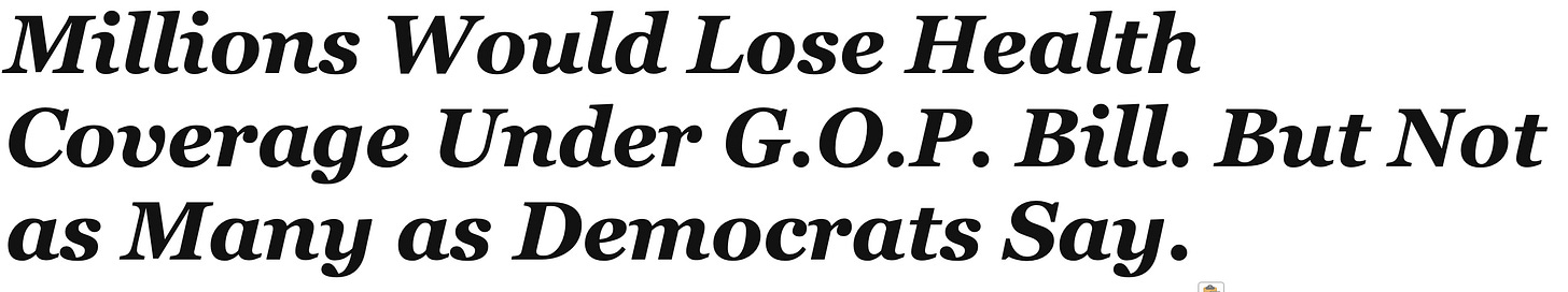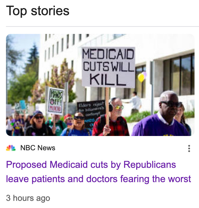 But still the manicured word-wranglers writing up the stories that the remaining Prestige Press consumers will see couch this outrage in the softest terms they can manage. Take the current NBC News headline: “‘Thicket of red tape’ for Medicaid in GOP bill sparks fears of coverage losses.” Look at the original headline as shown on Google News: