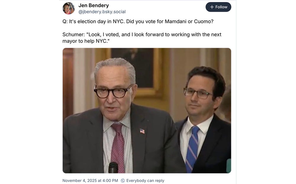 I said this before, but: Centrist, scaredy-cat, wishy-washy Chuck Schumer Democrats — the people who the blogger Atrios calls the Better Things Are Not Possible Caucus — have now lost to Donald Trump and Zohran Mamdani in a year.