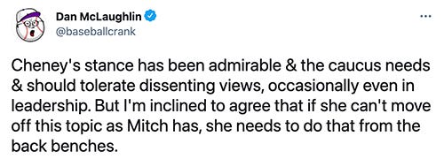 There’s National Review’s Dan McLaughlin, aka Baseball Crank, explaining in an embarrassing Twitter thread that “the party absolutely needs people who think like Liz Cheney” — they should just be put someplace far out of the way where people can’t see them: