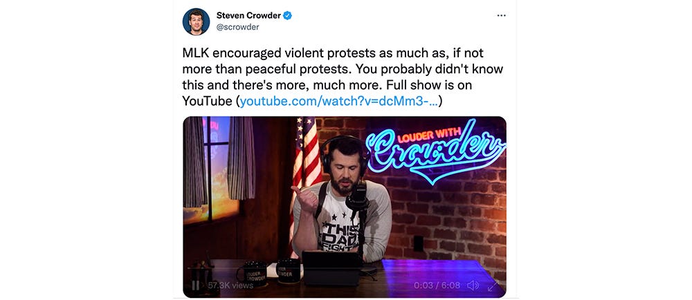If you think using one’s MLK Day platform to push a T-Bone Steaks and Cadillacs picture of black life is a bit rich, get a load of this from popular rightwing podcaster Steven Crowder: