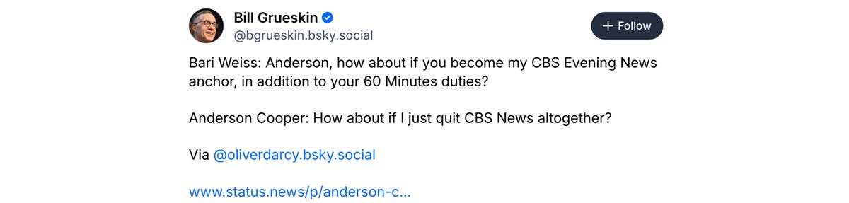 When Anderson Cooper noped out of CBS News, I saw a bunch of stuff like this from both insiders and non-insiders, suggesting that Bari Weiss had fucked up, driving this big star away with her maladministration:
