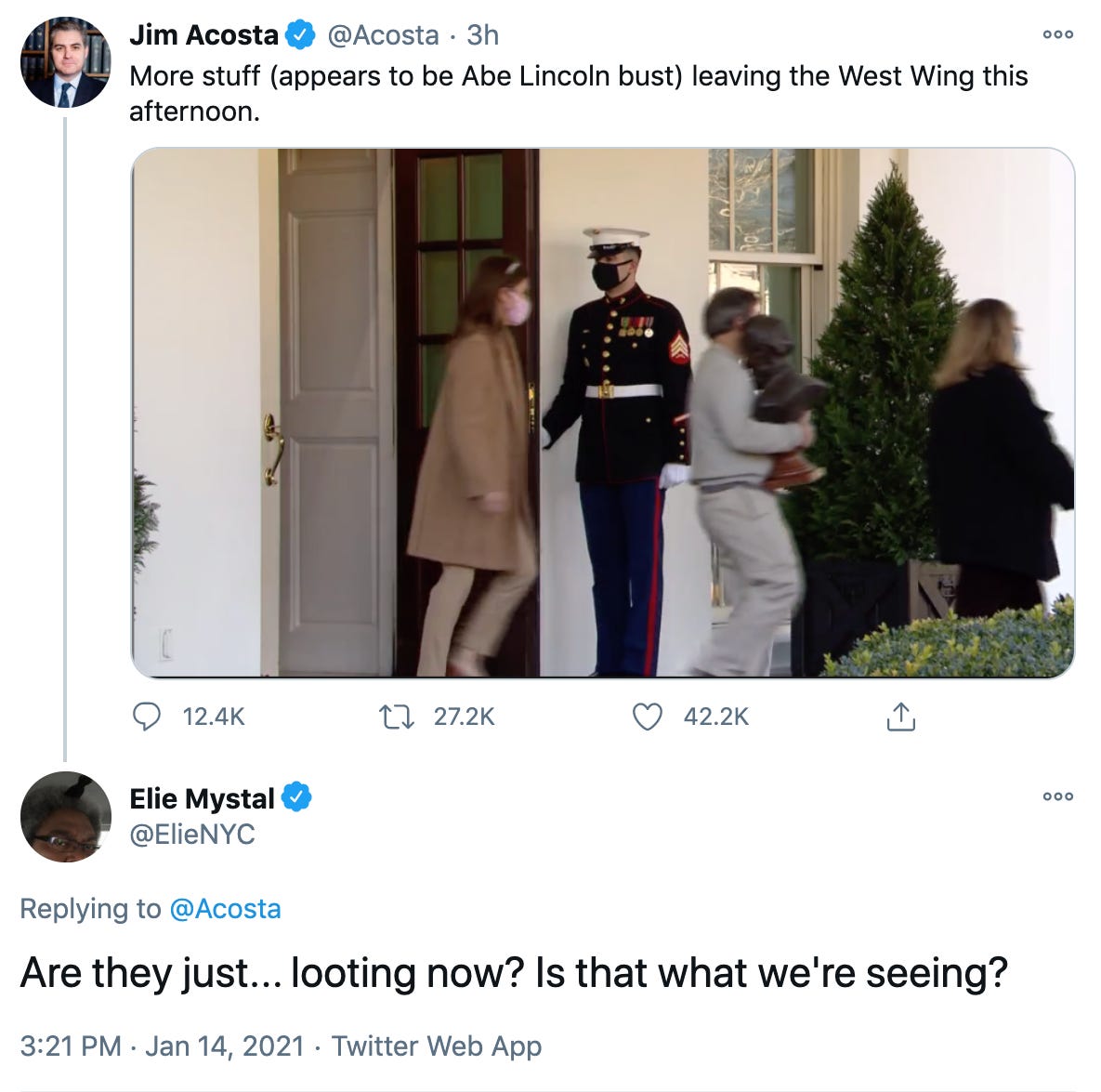 So, yeah--I would not be even slightly surprised to learn that Donald Trump is literally stripping the White House of everything that's not nailed down--and hiring men to pry loose as much of what is nailed down as possible. Because that's just the kind of petty thievery he would indulge in.