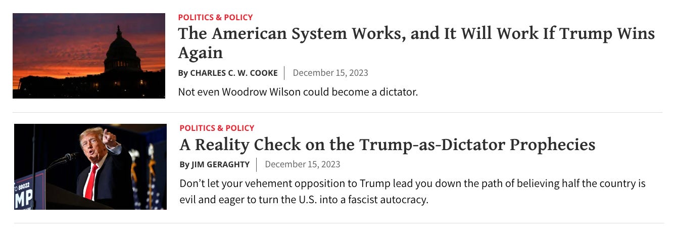 I rise in agreement with my National Review colleagues Jim Geraghty and Charles C.W. Cooke (and several others) that this whole “Trump will be a dictator” thing you may have been hearing lately is absurdly overblown.